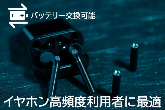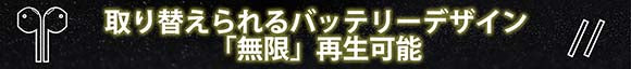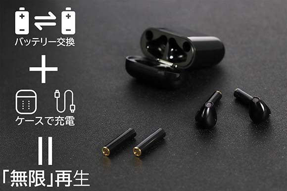 さらに、バッテリーの交換も数秒でできる簡単設計で、イヤホンを使用しながら充電ケースを充電すると「無限」再⽣ができます!