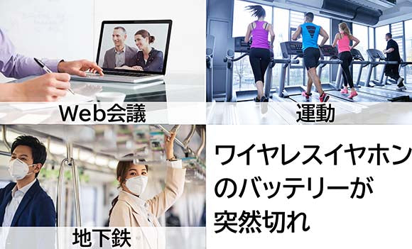 オンライン会議や電話中、運動中などにイヤホンのバッテリーが突然切れてしまった・・・