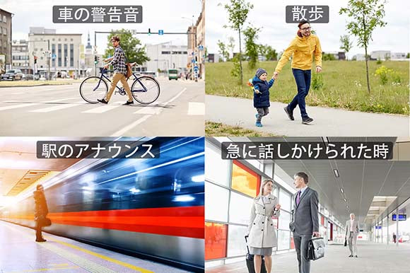 イヤホンを装着する時、乗り物のアナウンスや周囲の会話などが聞こえない場合があります。