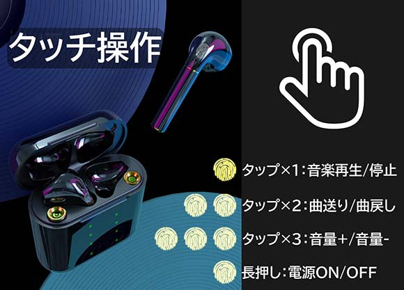 タッチ式で指で軽くタップするだけで曲送り/曲戻し、音楽再生/停止、電源オン/オフ、音量調整など基本的な動作はイヤホンで直感的に操作可能です。わざわざスマートフォンを取り出して操作する必要はありません。