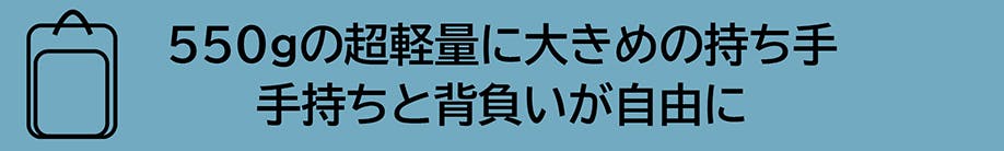 ■550gの超軽量に大きめの持ち手、手持ちと背負いが自由に