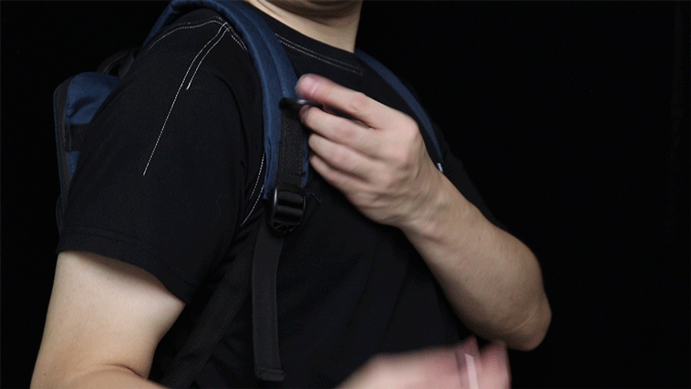 「RAINBO」は僅か8cmの薄さで、背負った状態で背中に密着し、体の一部のように違和感を感じません。