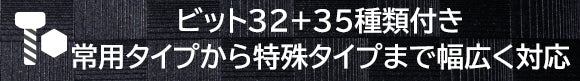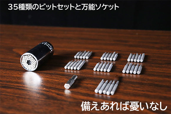 常用の32種類ビットの他に、精密機器や特殊ネジ用などに対応する35種類のビットセットと万能ソケットも付属しています。