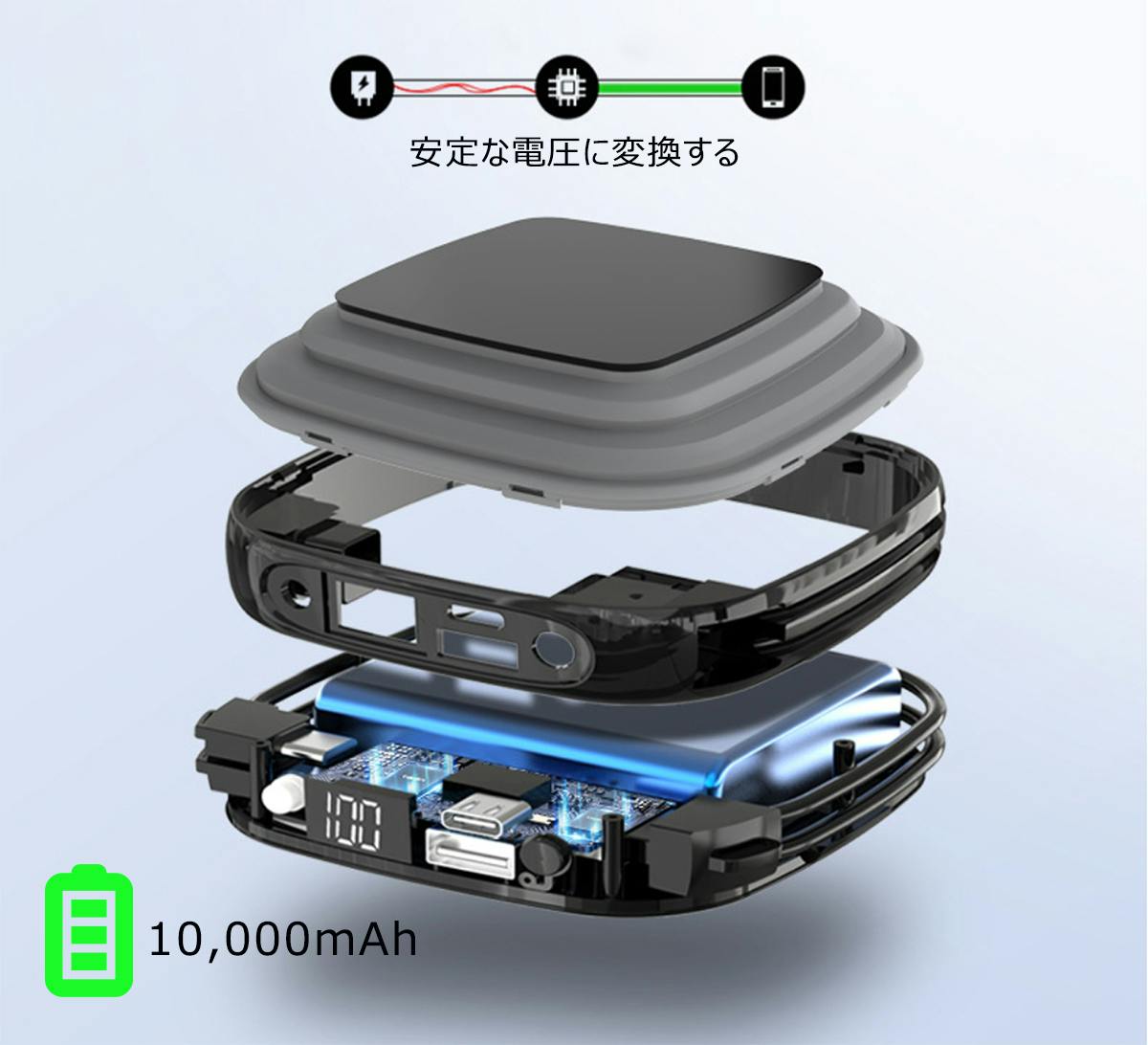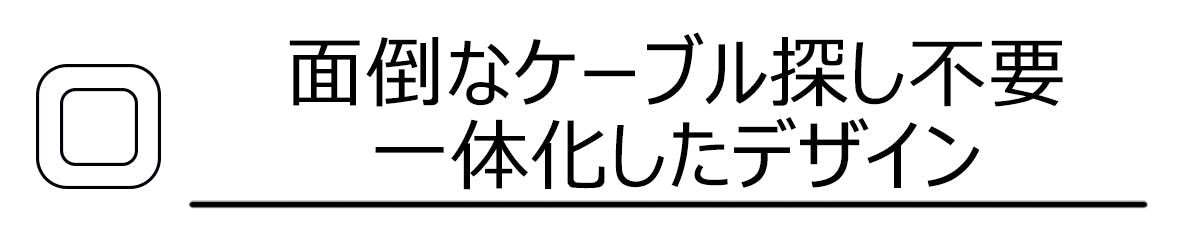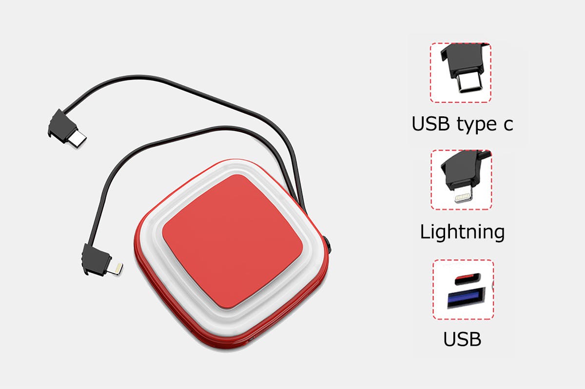 本体の周りに一体化した充電ケーブルはUSB type cとLightningを同時に対応できるため、利用時に面倒な充電ケーブル探しはいりません。