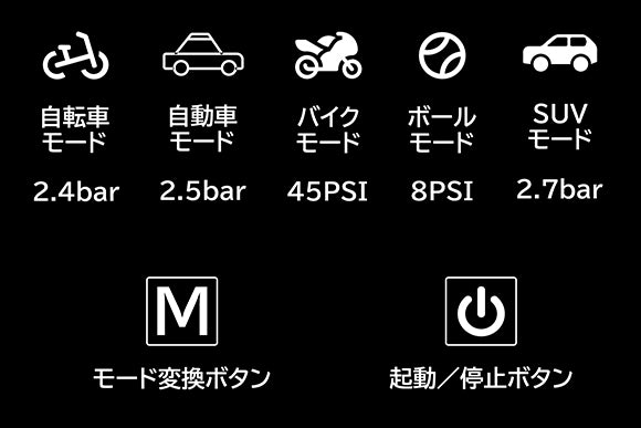 「SUV」、「自転車」、「自動車」、「オートバイ」と「ボール」の5種類の空気入れモードが予め設定され、具体的な空気圧がわからなくても設定されたモードで使用可能です。