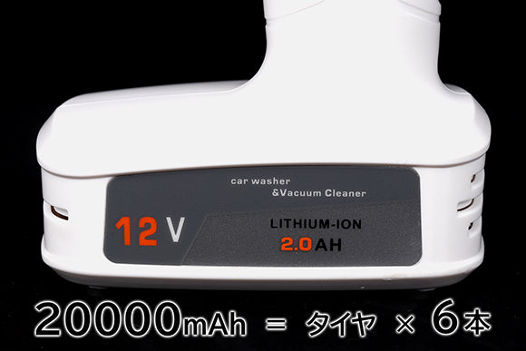 20000mAhのバッテリーを採用し、最大30分連続使用可能で、1回の充電で5回(6分/回)の洗車が可能です。