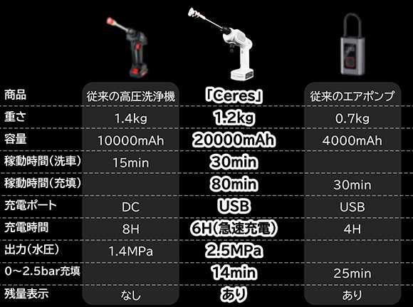 一体型設計を採用したため、従来型と比べバッテリーも使用時間もアップし、重量も軽くなっています。 また、照明、洗車、空気入れ、タイヤ空気圧測定の4つの機能が一つに、車内のスペースを大幅に節約します。